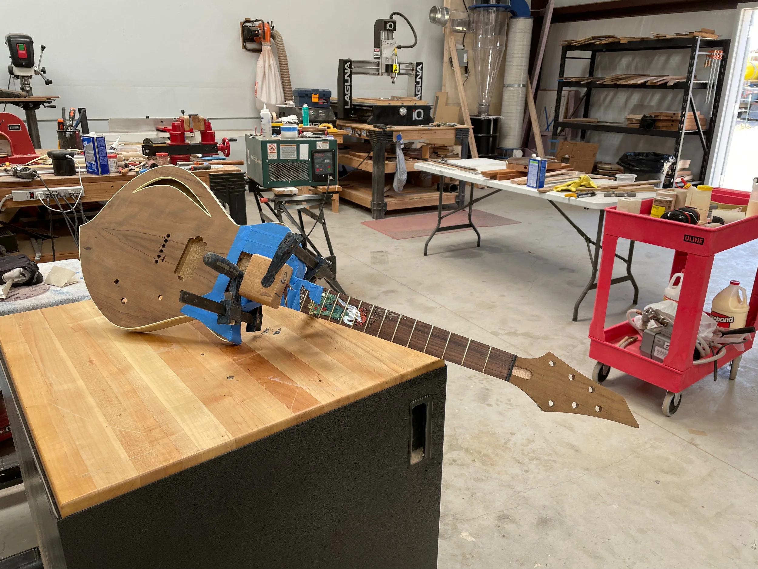 This was going to be a very special build for a very special client. Naturally, I still had the Imbuia top (actually two from the same billet), but I also had one body blank of one piece Black Limba that I’d been holding on to since 2014. This is significant in that it was the last piece from a board I had used to build Pat a guitar a few years prior. We decided on maple for the neck shaft, and I suggested using some curly maple that I received from Mike Shannon, Principal Master Builder of the Jackson Custom Shop. I hold Mike and his work in the highest regard, so I wanted to use some wood from that stash for this build. The specs came together pretty quickly, but I also added a few things that he hadn’t thought of, such as chambering out the body and adding what I call a WTF hole in the top. We agreed to leave the binding off of the neck and headstock, but add it to the body. I mentioned that there would probably be enough material to match the headstock to the body, and Pat shared that if there was enough material he’d like to have the control cover also be made from Imbuia “although I know you’re not a fan of this sort of thing.” He’s right, but I wasn’t going to say no.