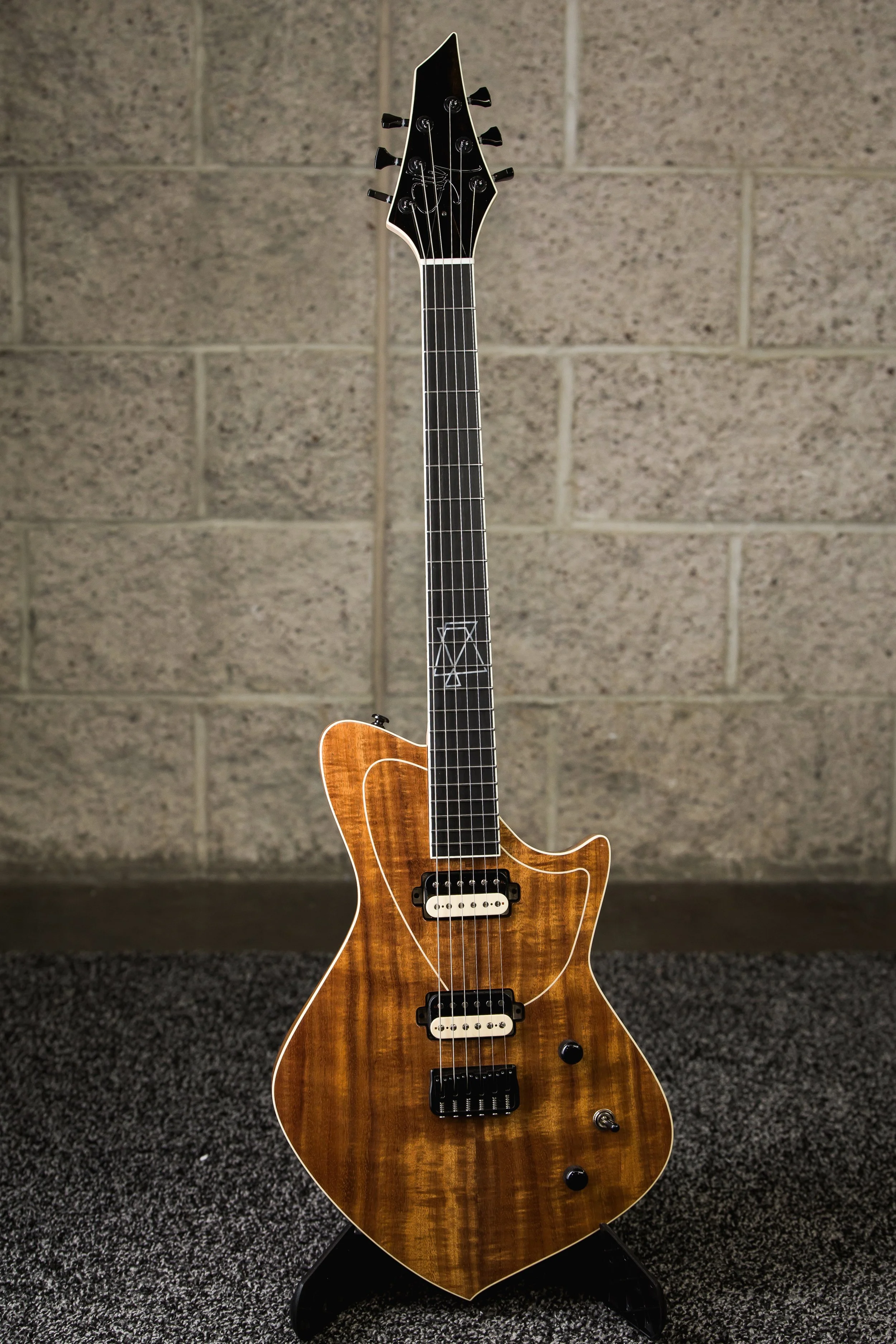 Stardust Deluxes have figured tops with the “pickguard” shape inlaid into the top, our custom geometric inlay at the 12th fret, and are often semi-hollow. The Stardust Deluxe is extremely limited as a USA Custom Series guitar, as I use it to showcase experimental design concepts utilizing exceptional cuts of wood and other unique components as they become available to me. That being said, please get in touch if you have any questions about getting your own Stardust Deluxe. I’ll see what we can do for you.